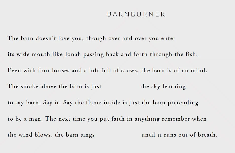Think of a sign near where you live or work to include in the poem. CASH ONLY, NO TRESPASSING, BEWARE OF DOG, JOHN 3:16--whatever. Imagine a prophet, or angel, or deceased relative is placing these signs trying to communicate with you, and what they’re trying to say. Please look up the definition of despair and redefine it. This can be a prose poem. The title should be titled after a visual piece or song, as if the poem is an ekphrasis, even though it’s not.